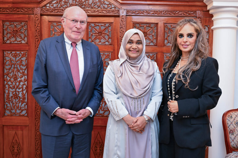 Professor Dr Frank Stangenberg-Haverkamp, Chairman of the Merck Foundation Board of Trustees and Former Chairman of the Executive Board of E. Merck KG, together with Senator Dr Rasha Kelej, CEO of the Merck Foundation, met with First Lady Madam Sajidha Mohamed this evening at the Official Residence of the President, Muleeaage.